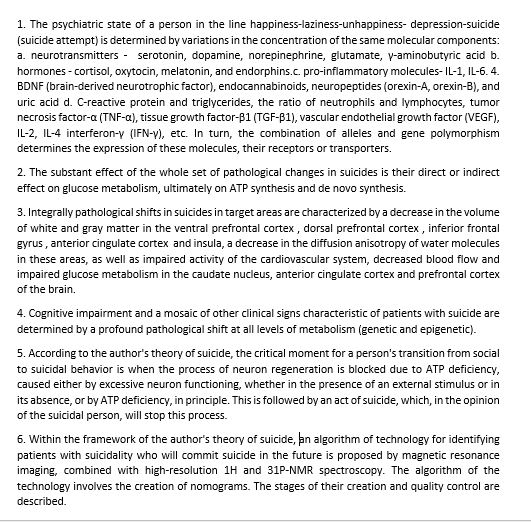 In fact, a psychiatrist is far from the essence of suicidality of a particular patient, which is explained solely by a violation of the metabolism of both the brain and the body as a whole. The psychiatric state of a person is described by the following terms - happiness- laziness-unhappiness- depression- suicide (suicide attempt). These conditions can be consistent elements of the pathophysiology of suicide. They reflect a consistent state of personality, which have commonality in terms of the influence of the metabolic components of the human body. An analysis of the relevant scientific literature revealed that: